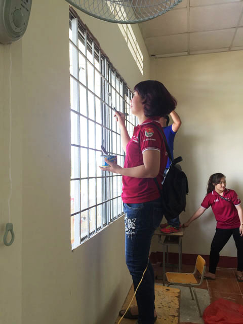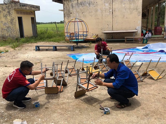 Các chiến sĩ tình nguyện sơn lại bàn ghế cho các em học sinh