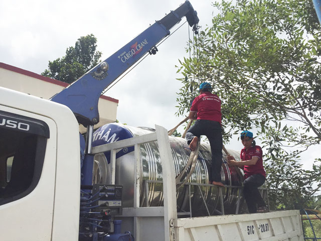 Chi đoàn Xí nghiệp Truyền dẫn nước sạch hỗ trợ vận chuyển bồn chứa nước sạch để trao tặng.