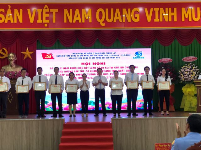 Tại hội nghị, sau phần Báo cáo tóm tắt sơ kết 01 năm thực hiện Kết luận số 01-KL/TW về tiếp tục Chỉ thị 05-CT/TW của Bộ Chính trị về tiếp tục đẩy mạnh học tập và làm theo tư tưởng, đạo đức, phong cách Hồ Chí Minh giai đoạn từ 19/5/2021 đến 19/5/2022 (video clip) là phần tuyên dương, khen thưởng cho 40 tập thể, 94 cá nhân toàn Tổng Công ty thực hiện tốt “Học tập và làm theo tư tưởng, đạo đức, phong cách Hồ Chí Minh năm 2021”. Xí Nghiệp Truyền dẫn Nước sạch có 03 cá nhân (Bà Nguyễn Thị Thanh Thúy, Ủy viên BCH Công đoàn Tổng Công ty, Đảng ủy viên cơ sở, Trưởng Ban Tổ chức Hành chính, Ông Nguyễn Quốc Thắng, Phó Đội Trưởng Đội Quản lý Đồng hồ tổng, Bà Nguyễn Thị Nguyệt, Ủy viên BCH Đoàn Tổng Công ty, Bí thư Chi đoàn, Nhân viên BanTổ chức Hành chính); 02 tập thể (Công đoàn cơ sở, Chi bộ 2- Đảng bộ Xí nghiệp Truyền dẫn Nước sạch) được tuyên dương, khen thưởng.